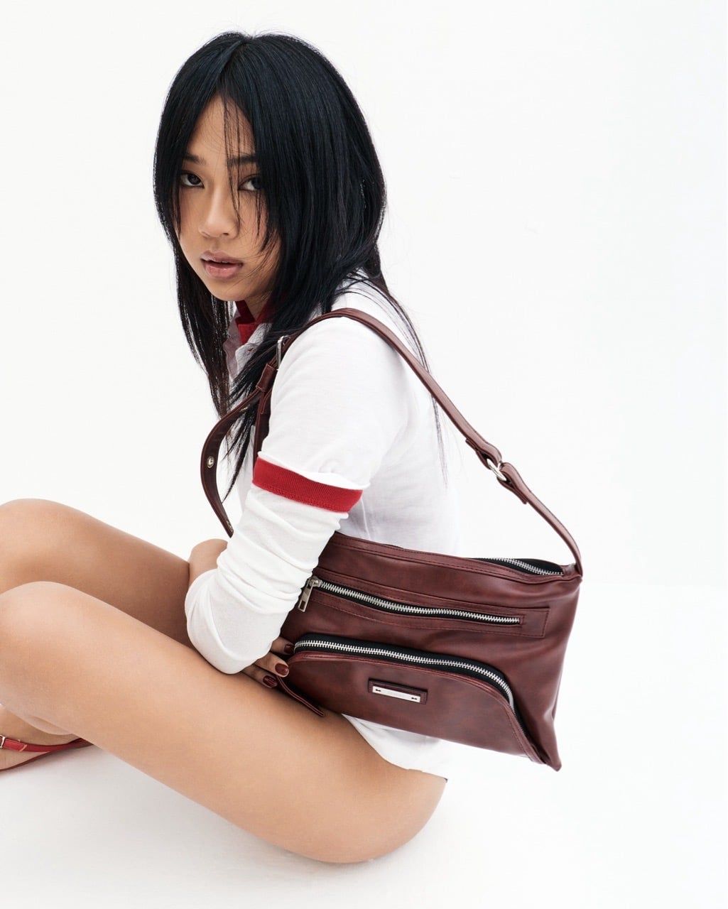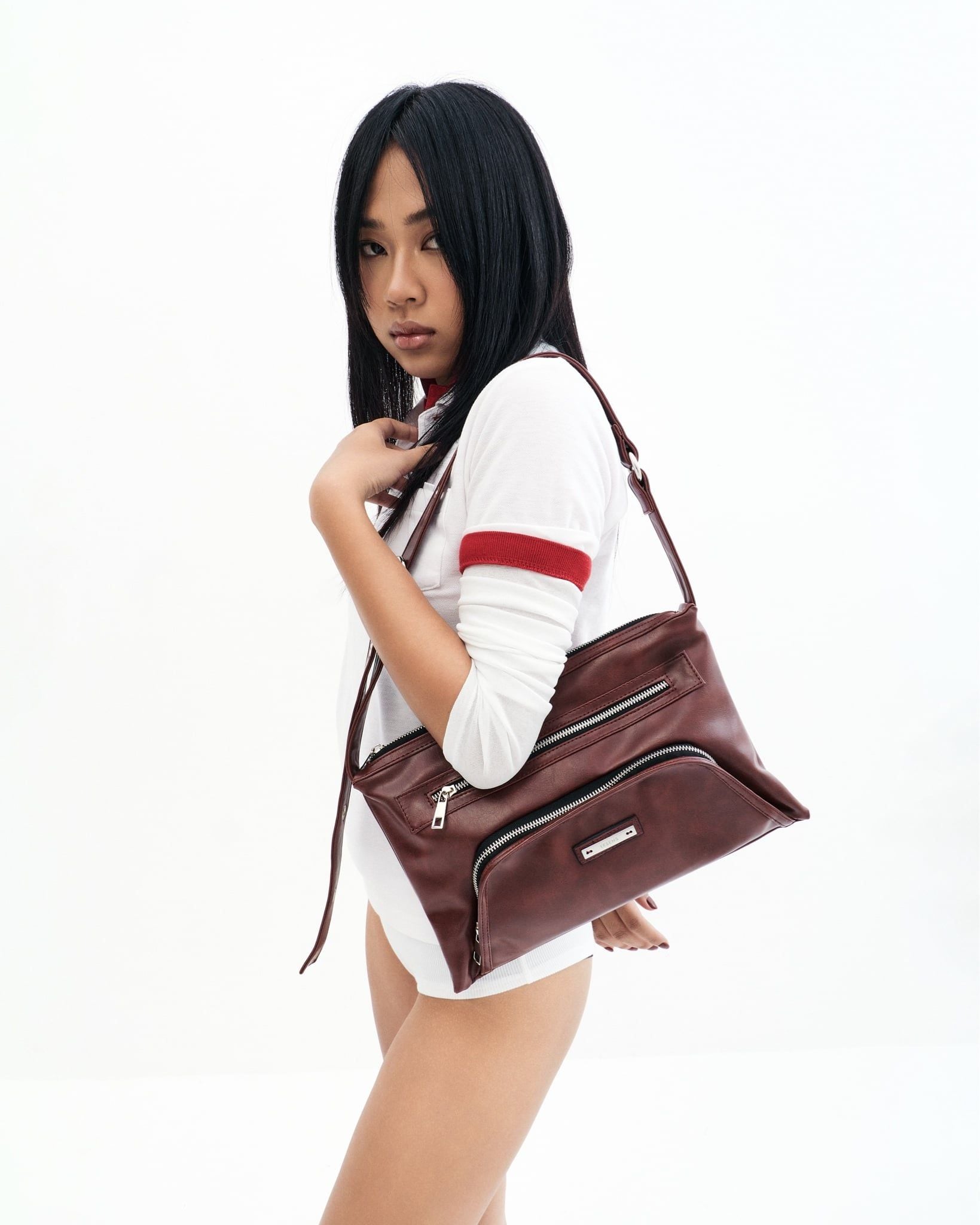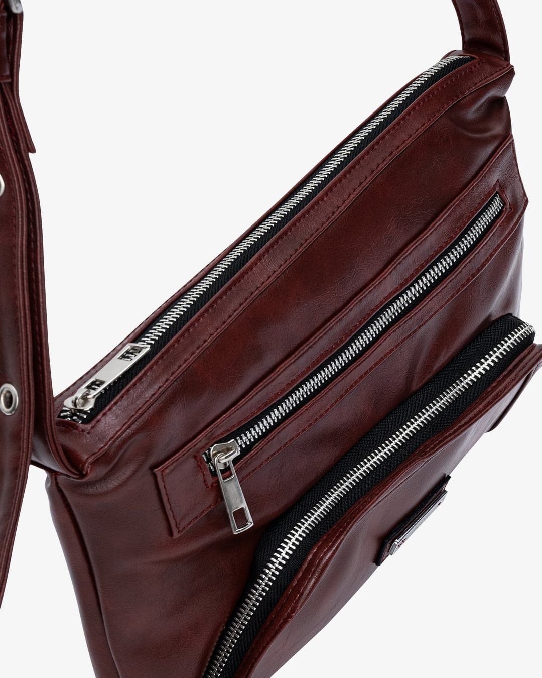 At the front, the bag features two distinct zipped compartments: one classic straight zip pocket and another with a uniquely trapezoidal shape. Crafted from durable faux leather that resists stains while retaining a soft, cotton-like feel, this versatile bag is made to be worn with ease across seasons. Designed as a unisex piece, it includes adjustable straps that can transform the bag into either a shoulder or crossbody style — effortlessly complementing any outfit.