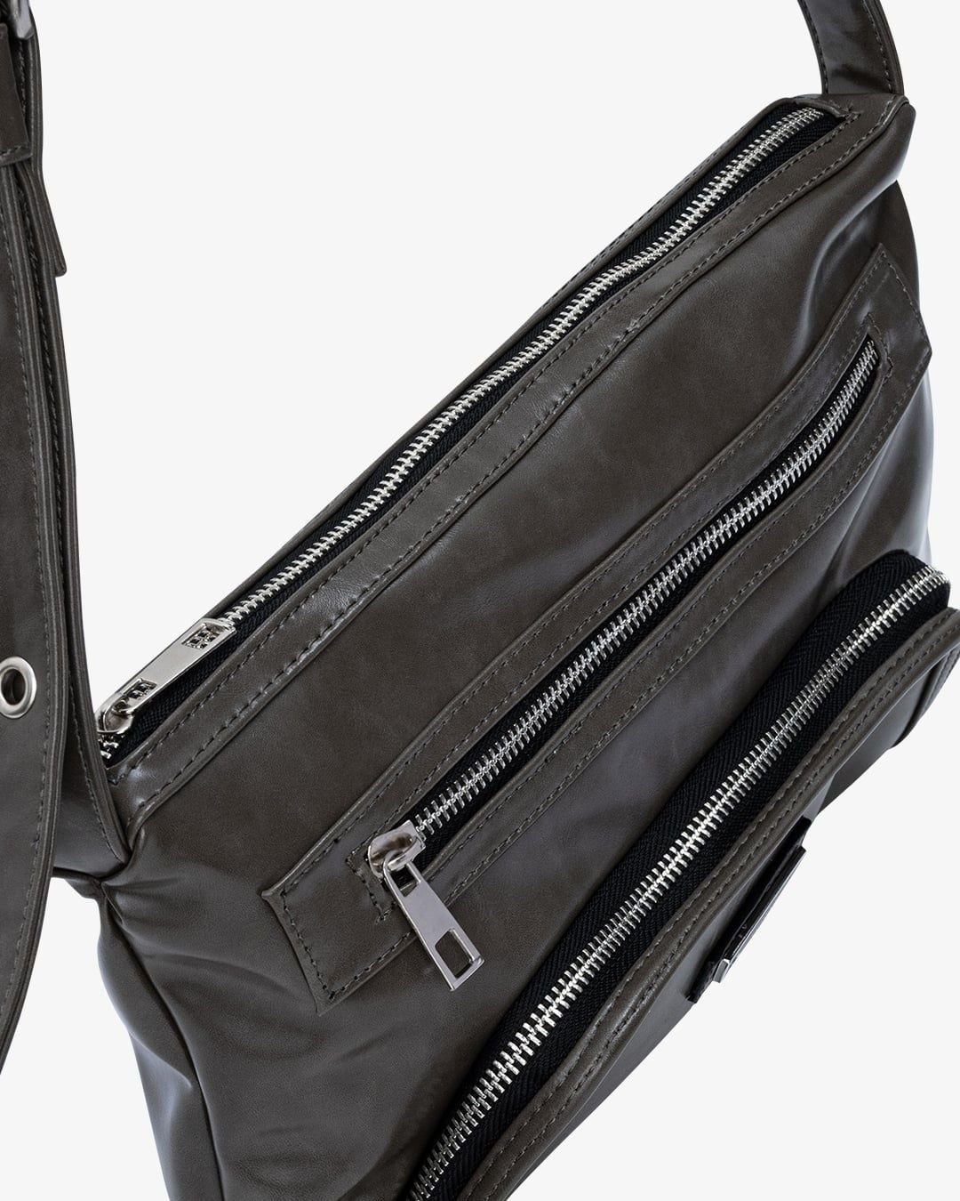 At the front, the bag features two distinct zipped compartments: one classic straight zip pocket and another with a uniquely trapezoidal shape. Crafted from durable faux leather that resists stains while retaining a soft, cotton-like feel, this versatile bag is made to be worn with ease across seasons. Designed as a unisex piece, it includes adjustable straps that can transform the bag into either a shoulder or crossbody style — effortlessly complementing any outfit.